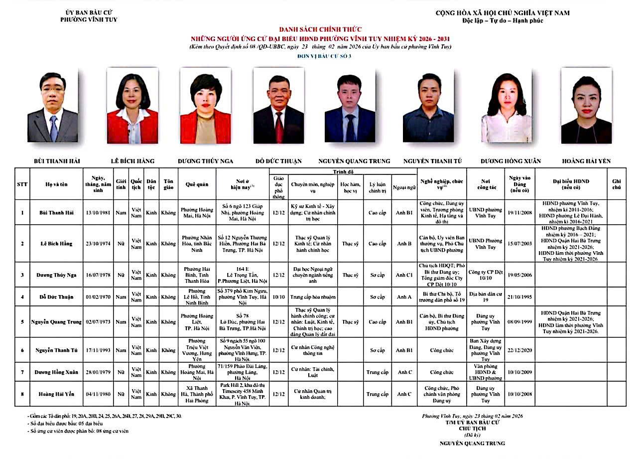 Ủy ban Bầu cử phường Vĩnh Tuy đã ban hành Quyết định số 08/QĐ-UBBC ngày 23/02/2026 về việc công bố danh sách chính thức những người ứng cử đại biểu HĐND phường Vĩnh Tuy khóa II, nhiệm kỳ 2026–2031 theo từng đơn vị bầu cử