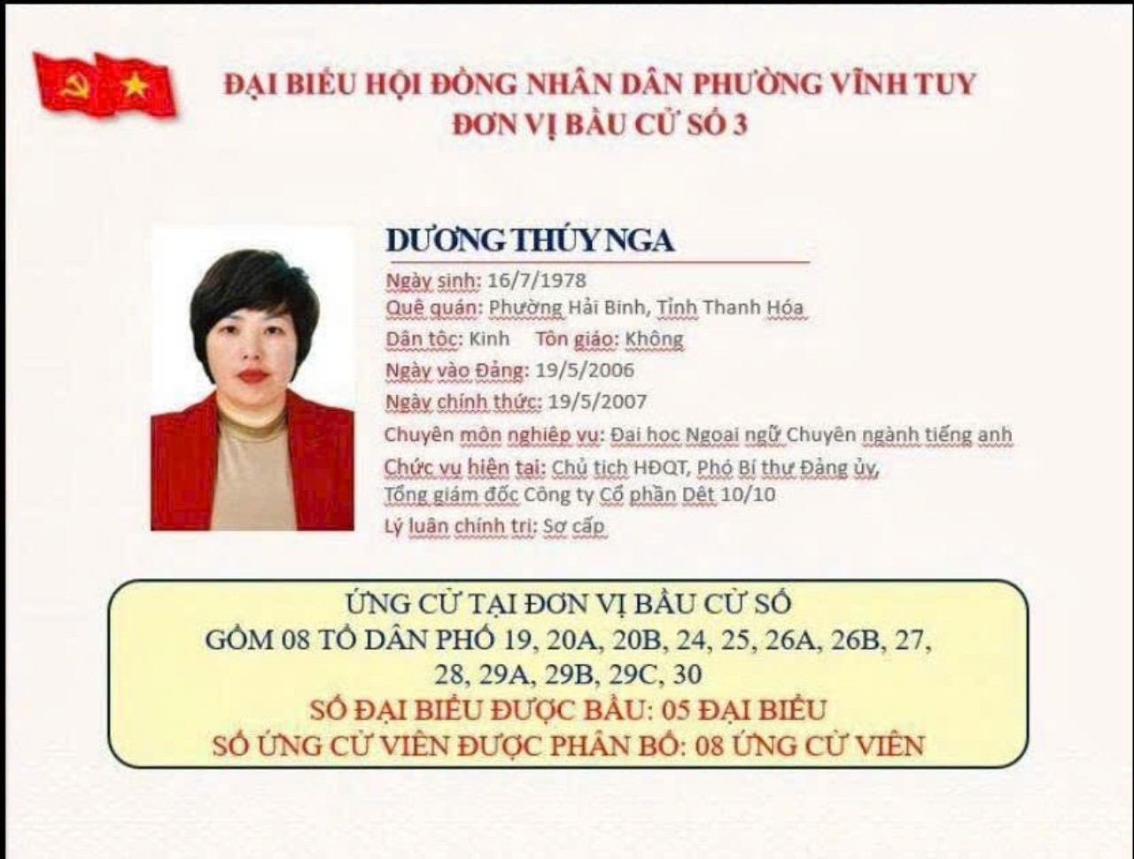 Và thật vinh dự và tự hào khi Đồng Chí Dương Thúy Nga: Chủ Tịch Hội Đồng Quản Trị- Phó Bí Thư Đảng Uỷ- Tổng Giám Đốc Công Ty Cổ Phần Dệt 10/10 ứng cử đại biểu Hội đồng Nhân Dân phường Vĩnh Tuy nhiệm kỳ 2026-2031