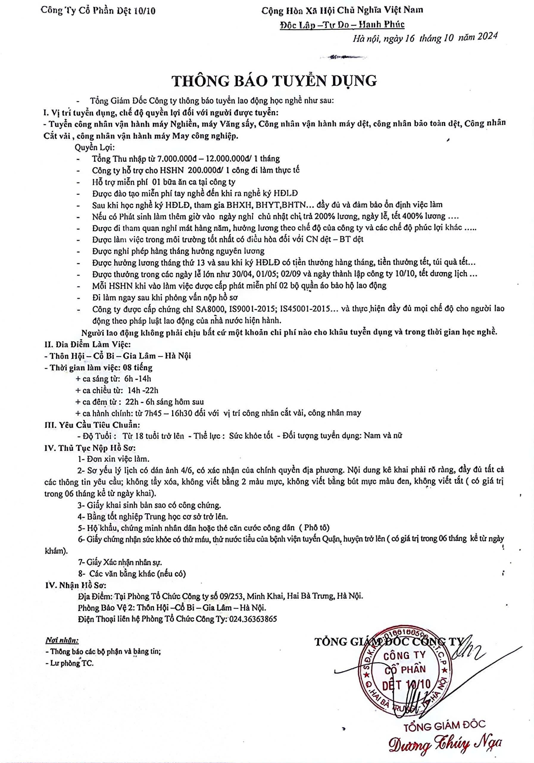 Công ty cổ phần Dệt 10/10 thông báo tuyển dụng