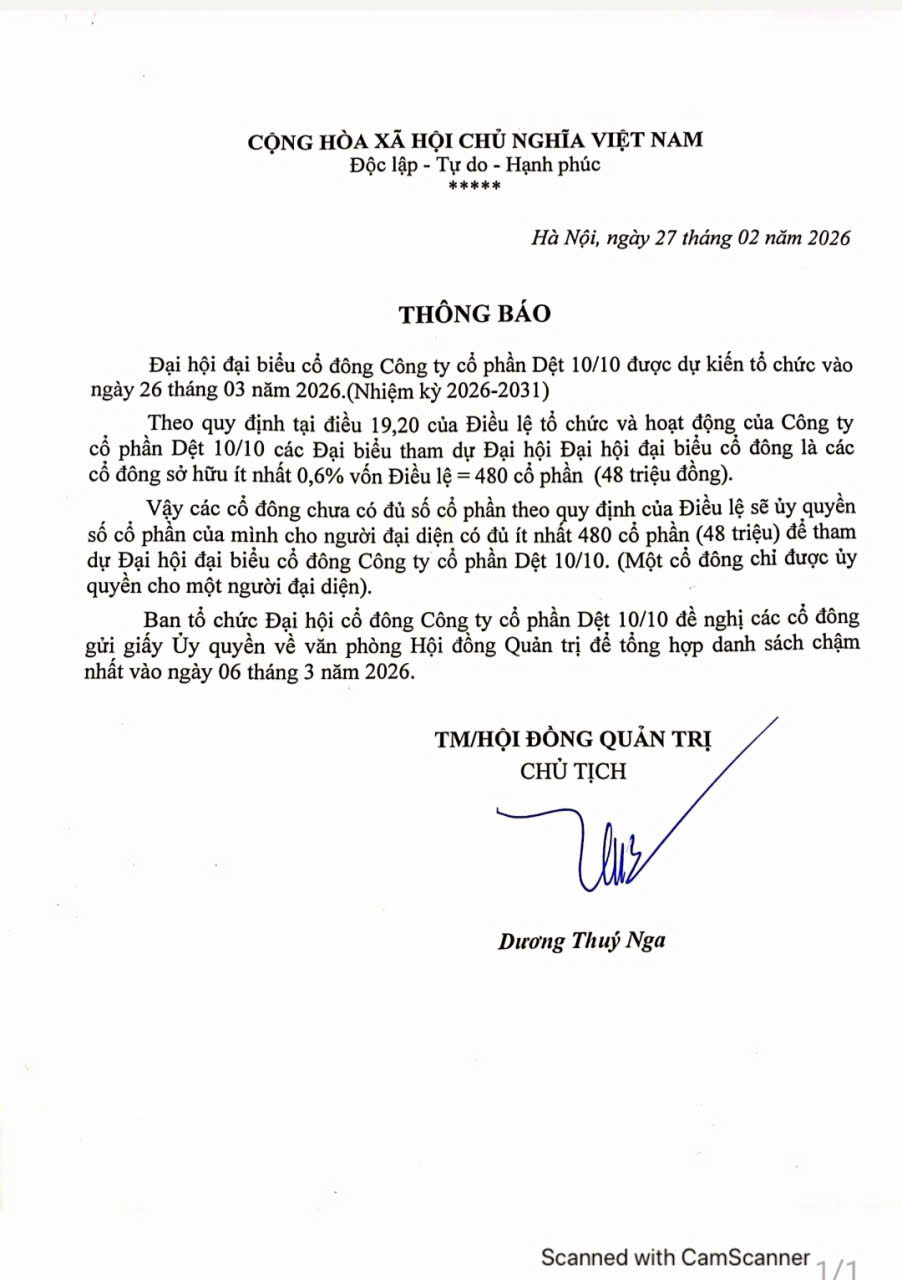 Thông Báo Đại Hội Đại Biểu Cổ Đông Công Ty Cổ Phần Dệt 10/10 Thứ Sáu, 27/02/2026 CÔNG TY CỔ PHẦN DỆT 10/10 Viết bình luận của bạn Gửi thông tin Danh mục Giới thiệu Sản phẩm Màn mắc đôi Màn mắc đơn (cá nhân) Màn chụp tự bung thông minh Màn công năng Video Tin tức FAQ Liên hệ Tin mới nhất 1 HỘI NGHỊ TIẾP XÚC CỬ TRI VỚI NGƯỜI ỨNG CỬ ĐẠI BIỂU HỘI ĐỒNG NHÂN DÂN PHƯỜNG VĨNH TUY NHIỆM KỲ 2026-2031. ĐƠN VỊ BẦU CỬ SỐ 03 ( TỔ DÂN PHỐ SỐ: 19, 20A, 20B, 24, 25, 26A, 26B, 27, 28, 29A, 29B, 29C, 30) 05/03/2026 2 CÔNG BỐ DANH SÁCH CHÍNH THỨC NHỮNG NGƯỜI ỨNG CỬ ĐẠI BIỂU HĐND PHƯỜNG VĨNH TUY, NHIỆM KỲ 2026–2031. 03/03/2026 3 Thông Báo Đại Hội Đại Biểu Cổ Đông Công Ty Cổ Phần Dệt 10/10 27/02/2026 4 CÔNG TY CP DỆT 10-10 THÔNG BÁO NGHỈ LỄ TẾT BÍNH NGỌ 2026 09/02/2026 5 HÀNH TRÌNH TRI ÂN & SẺ CHIA VỚI MẢNH ĐẤT ĐỊA ĐẦU TỔ QUỐC- HÀ GIANG 26/01/2026 Tin liên quan 05/03/2026 HỘI NGHỊ TIẾP XÚC CỬ TRI VỚI NGƯỜI ỨNG CỬ ĐẠI BIỂU HỘI ĐỒNG NHÂN DÂN PHƯỜNG VĨNH TUY NHIỆM KỲ 2026-2031. ĐƠN VỊ BẦU CỬ SỐ 03 ( TỔ DÂN PHỐ SỐ: 19, 20A, 20B, 24, 25, 26A, 26B, 27, 28, 29A, 29B, 29C, 30) HỘI NGHỊ TIẾP XÚC CỬ TRI VỚI NGƯỜI ỨNG CỬ ĐẠI BIỂU HỘI ĐỒNG NHÂN DÂN PHƯỜNG VĨNH TUY NHIỆM KỲ 2026-2031. ĐƠN VỊ BẦU CỬ SỐ 03 ( TỔ DÂN... Đọc tiếp 03/03/2026 CÔNG BỐ DANH SÁCH CHÍNH THỨC NHỮNG NGƯỜI ỨNG CỬ ĐẠI BIỂU HĐND PHƯỜNG VĨNH TUY, NHIỆM KỲ 2026–2031. Quyết định Về việc công bố danh sách chính thức những người ứng cử đại biểu Hội đồng nhân dân phường Vĩnh Tuy nhiệm kỳ 2026 - 2031 theo từng... Đọc tiếp 27/02/2026 Thông Báo Đại Hội Đại Biểu Cổ Đông Công Ty Cổ Phần Dệt 10/10 Đọc tiếp